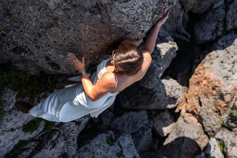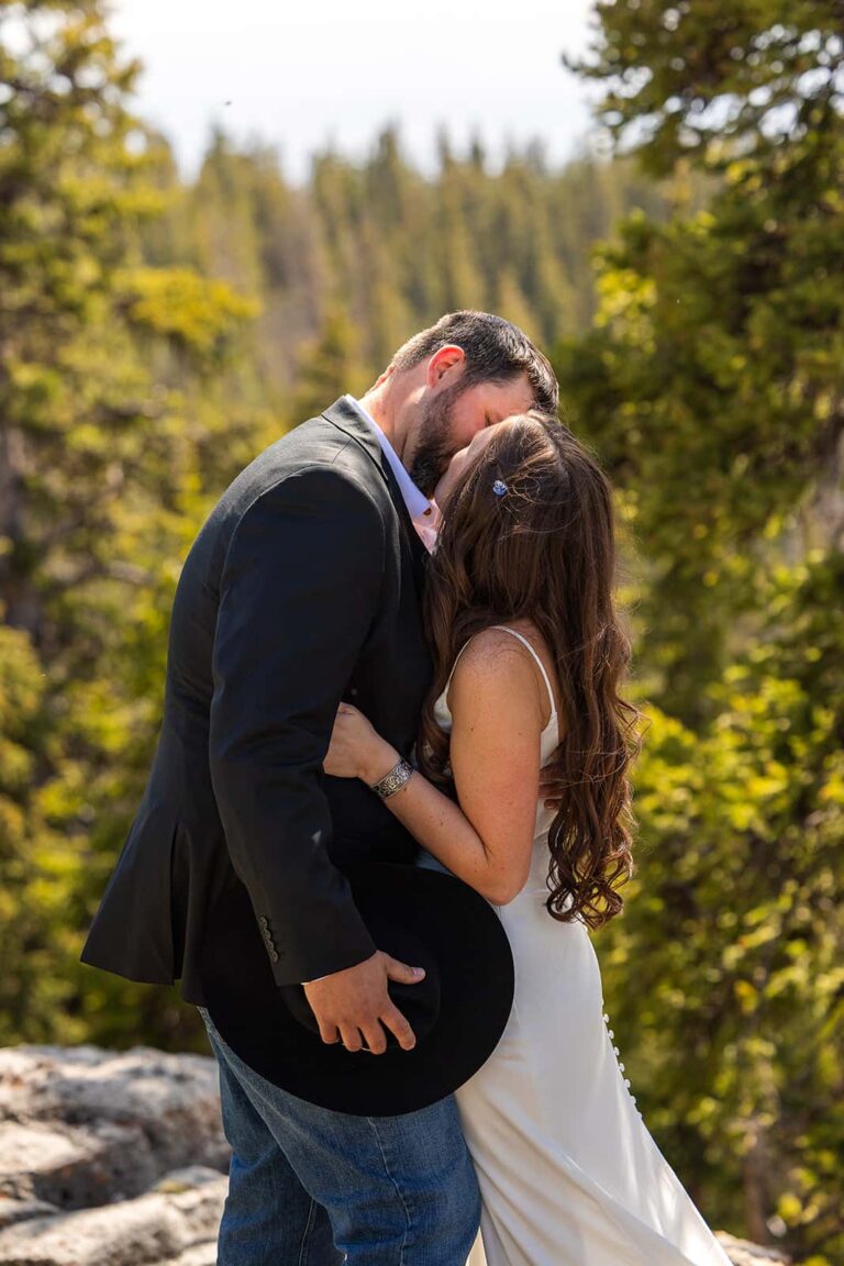 At the top, with sweeping views of Meadowlark Lake and mountains, surrounded by the coziness of the forest, one of their closest friends led their ceremony. Afterward, instead of heading to a reception hall, they stayed right there, exploring the rocky terrain, scrambling out to the perfect overlook, fully embracing the wildness of the place they chose to get married.